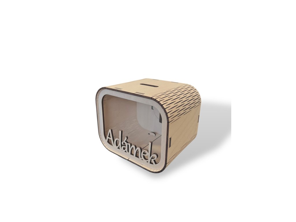 Kasička s vlastním jménem z překližky a plexiskla je skvělým pomocníkem na spoření i pro ty nejmenší!