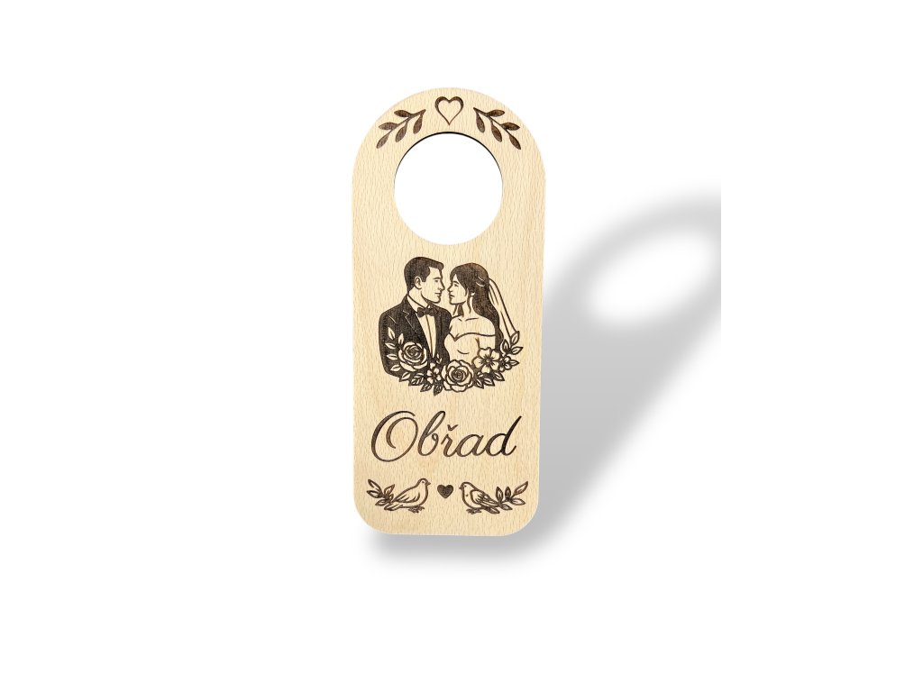 Originální dřevěná cedulka na kliku k označení obřadní místnosti je ideálním svatebním doplňkem pro svatební den i přípravy. Romantický motiv ženicha a nevěsty s jemnými detaily je laserově vygravírovaný do kvalitní bukové překližky, která zajišťuje přírodní vzhled a dlouhou životnost.